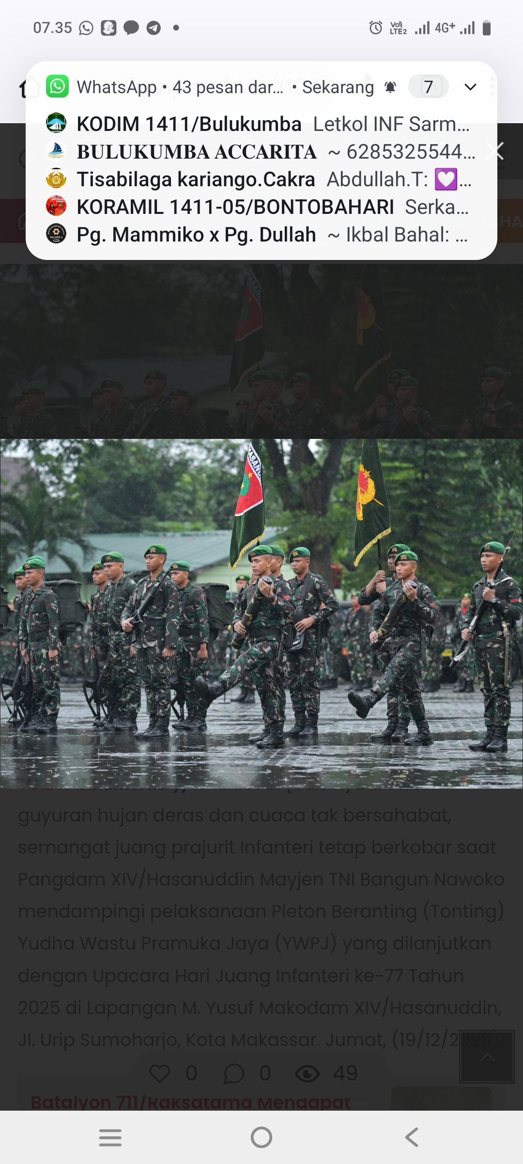 KABAR 21 // Makassar [Sulsel] Dibawah guyuran hujan deras dan cuaca tak bersahabat, semangat juang prajurit Infanteri tetap berkobar saat Pangdam XIV/Hasanuddin Mayjen TNI Bangun Nawoko mendampingi pelaksanaan Pleton Beranting (Tonting) Yudha Wastu Pramuka Jaya (YWPJ) yang dilanjutkan dengan Upacara Hari Juang Infanteri ke-77 Tahun 2025 di Lapangan M. Yusuf Makodam XIV/Hasanuddin, Jl. Urip Sumoharjo, Kota Makassar. Jumat, (19/12/2025).