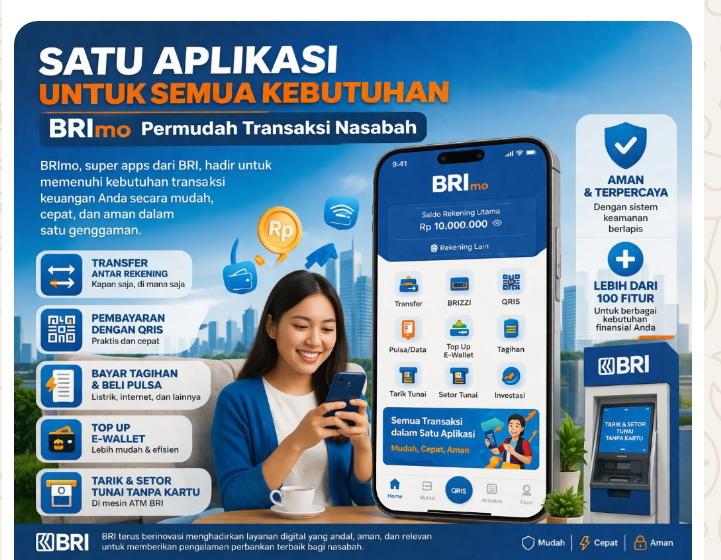 Dengan dukungan lebih dari 100 fitur, BRImo menjadi solusi untuk berbagai kebutuhan transaksi dan layanan keuangan nasabah. BRI akan terus mengembangkan layanan digital yang andal, aman, dan relevan guna memberikan pengalaman terbaik dalam setiap aktivitas keuangan.
